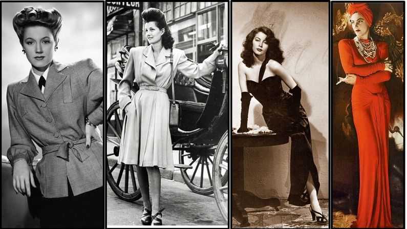 Nos anos 40, o clima era de segunda guerra mundial, tempo de escassez e tristeza, o que se refletiu no visual com cores sóbrias, roupas funcionais e austeras e sapatos robustos. Mas por outro lado, o cinema continuou influenciando e trazia a nova imagem de mulher sedutora, com vestido preto tomara que caia, cabelos médios e ondulados. E havia espaço ainda para a influência da “pequena notável” Carmem Miranda, que passeava pela música e pelo cinema e com toda sua ousadia, influenciou com turbantes, colares de bolas, estampas floridas e tropicais, sapatos com plataforma e uma beleza exuberante.