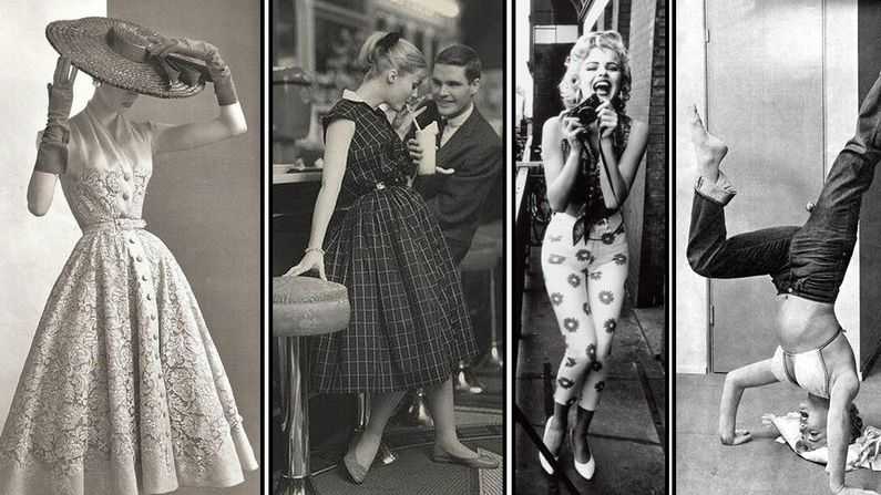 Nos anos 50, cujo clima já começou a se definir nos anos que vieram depois de 1945, quando termina a segunda guerra mundial, de um lado, havia as chamadas “mulheres perfeitas” que voltam a ser extremamente femininas, românticas, dedicadas ao lar e a família, vestidas pelos trajes da alta costura, que estava em seu auge, ou pelas imitações destes, muitas vezes feitas em casa. Vestidos de cintura marcada e saia rodada estampados com poás, listrados e florais. De outro lado, uma nova geração se formava e as meninas passam a ter seu próprio estilo, adaptando a silhueta da moda ao seu jeitinho…saias um pouco mais curtas usadas com sapatos baixos ou tênis, cabelos curtos ou em rabos de cavalo que se movimentavam ao som do rock n’ roll, que estourava nas paradas de sucesso. Outras peças foram surgindo, como calças e shorts, que tiveram o cinema como vitrine, quando mulheres ousadas aparecem usando calça jeans, como fez Marylim Monroe, que também pousou para a primeira capa da revista Playboy, lançada na época. Tempos revolucionários…