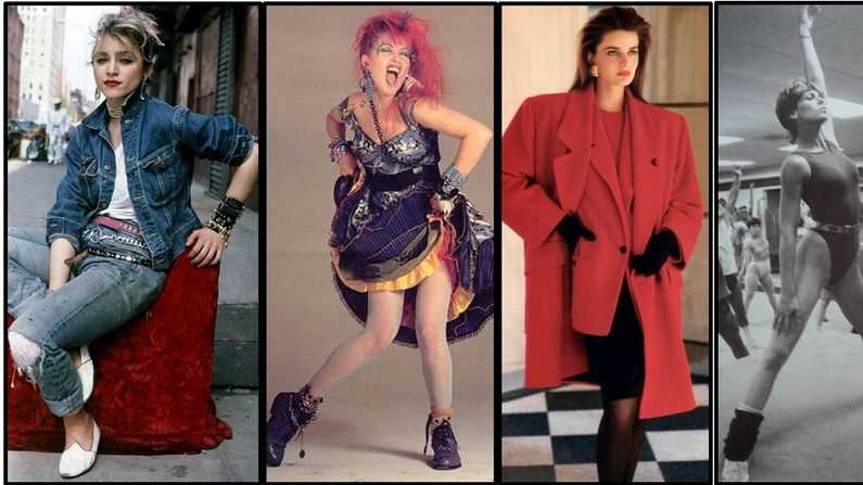 Nos anos 80, uma das heranças da década anterior foi o movimento punk, que nasceu nas ruas, mas se espalhou pelas passarelas e cenário musical. Resultado? Popularização do estilo, que se manifestou de várias formas e em várias camadas sociais, com cabelos “espetados”, metais, camisetas e calças jeans com efeito “destruído”, formando uma imagem de rebeldia, bem a cara da época. Por outro lado, figurinos glamourosos e muitas vezes extravagantes vinham dos shows musicais e é claro, influenciaram a massa, com peças cobertas de paetês, lantejoulas ou tecidos brilhantes…também continuação dos anos 70. O corpo ideal era musculoso, sob a influência de artistas como Madonna. Isso fez bombar as academias, os ginásios e as escolas de dança. Resultado no visual? Roupas justas, polainas, leggings, bodys (na época chamados de colãns) e cores bem vibrantes, contrastes de cor e elementos dos uniformes esportivos como números e listras da Adidas…o visual esportivo se tornou uma expressão da influência da música negra, principalmente no que se refere ao hip hop, com o complemento dos colares pesados e anéis de ouro (sinal de poder). Mas como essa foi uma década dos contrastes, veio a tendência do oversize, por causa da influência do design apresentado pelos estilistas japoneses, tendência chamada de japonismo. E como se não bastasse, ainda houve a influência do período Barroco, trazendo cabeleiras “selvagens”, mangas bufantes, saias volumosas, maquiagens pesadas e excessos de forma geral.